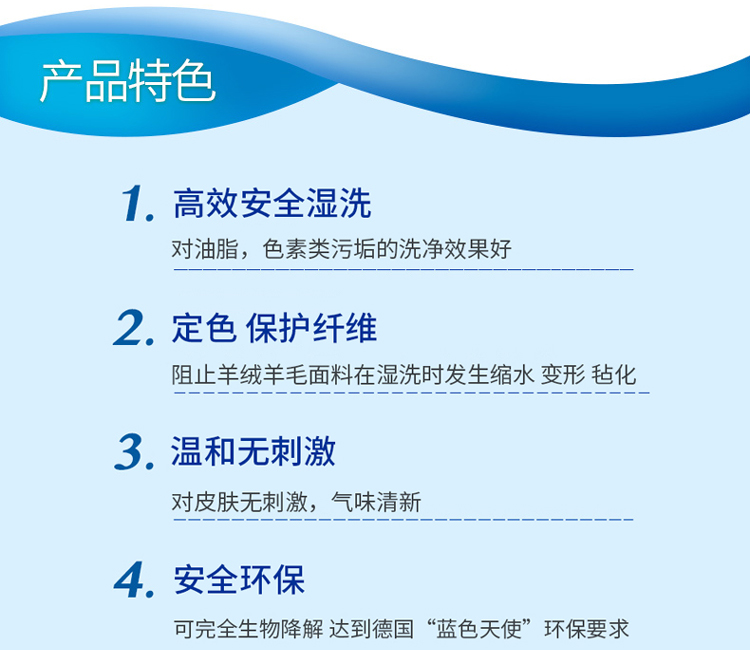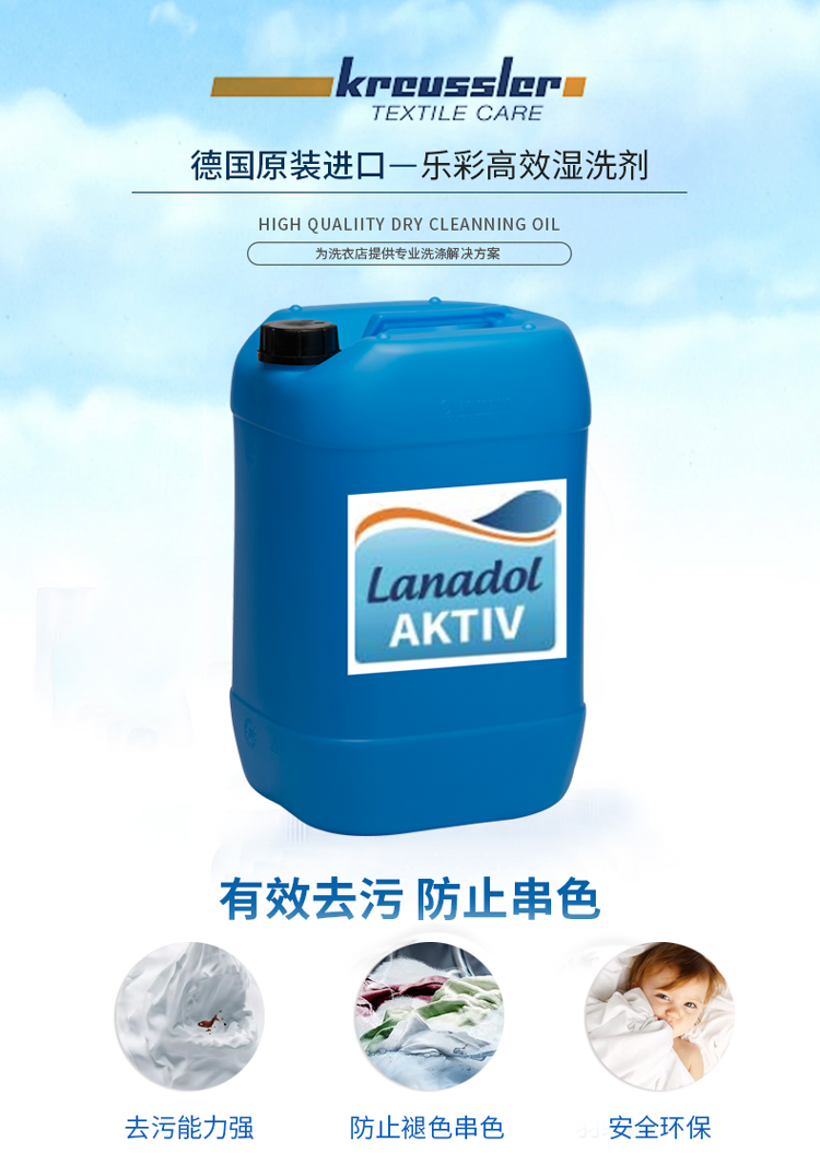 • 產(chǎn)品描述:用于“樂彩”濕洗程序中的高效安全濕洗劑,對(duì)油脂,色素類污垢的洗凈效果好,在低溫與低機(jī)械力的特殊濕洗條件下能洗凈衣物的同時(shí),又保護(hù)面料的材質(zhì)與色彩。 含有定色與纖維保護(hù)成分,阻止羊絨羊毛面料在濕洗時(shí)發(fā)生縮水,變形,氈化的情況。對(duì)皮毛,絲綢安全。大大降低敏感面料在水中褪色與竄色的風(fēng)險(xiǎn)。極端低泡沫配方,可以用在機(jī)洗與手洗。 可完全生物降解,對(duì)皮膚無刺激,氣味清新,達(dá)到德國“藍(lán)色天使”標(biāo)志環(huán)保要求。