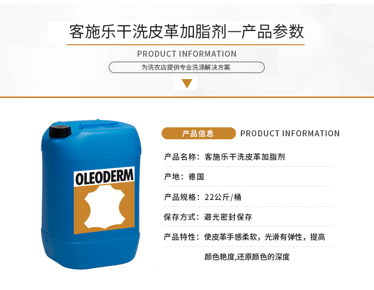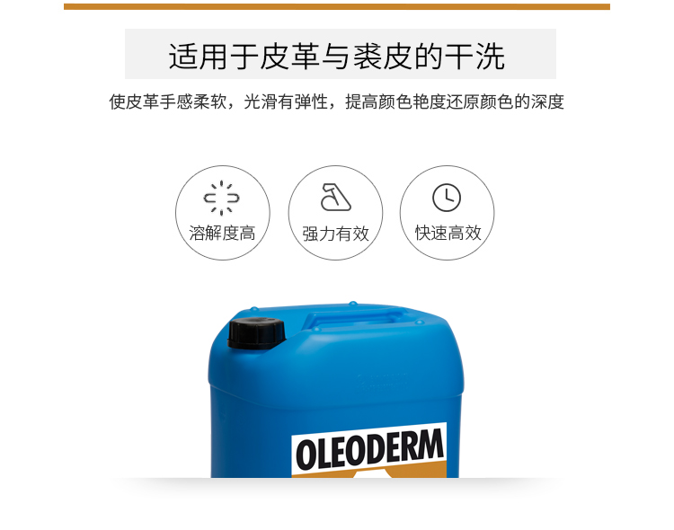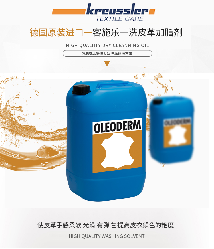 • 產(chǎn)品描述:適用于各種溶劑的干洗系統(tǒng),深入滲透皮革內(nèi)部,使皮革手感柔軟,光滑,有彈性。 加脂的同時(shí)提升清洗效力并有固色功能,提高皮衣顏色的艷度,還原皮衣顏色的深度 提升皮毛的防水功能,減少皮衣穿著時(shí)遇水形成水斑的情況,易于下次清洗保養(yǎng)