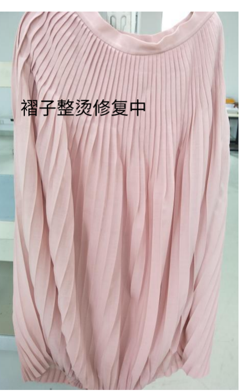 下圖是一件價(jià)值19600元人民幣的Loro Piana羊絨百褶裙,由于沒按洗標(biāo)要求進(jìn)行干洗,下水后,蛋白質(zhì)纖維溶脹,導(dǎo)致褶子完全消失,手工整燙修復(fù)中……